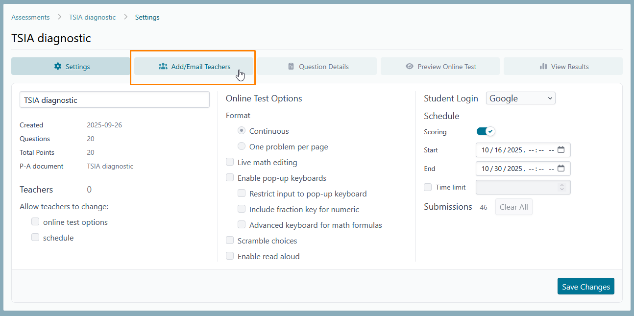 Follow these steps to create a district-wide test, set a testing window (optional start and end times), and send test links to teachers.