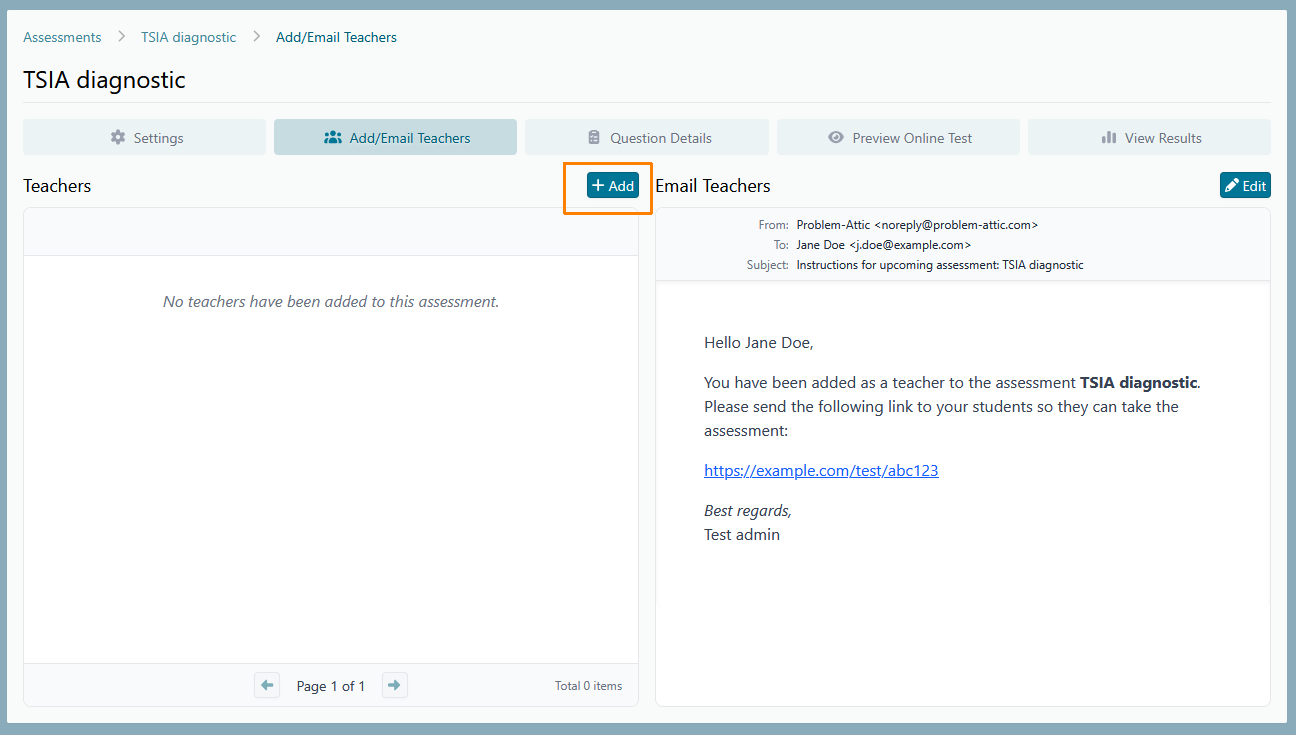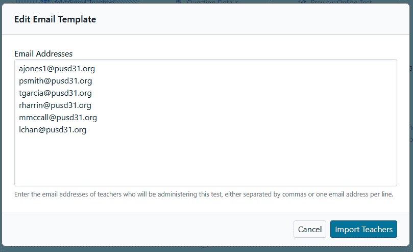 Step 10. At first the list of teachers will be empty. You need to add addresses for those teachers who will be administering the test. Important: they must all be registered users of Problem-Attic and associated with your school district.
