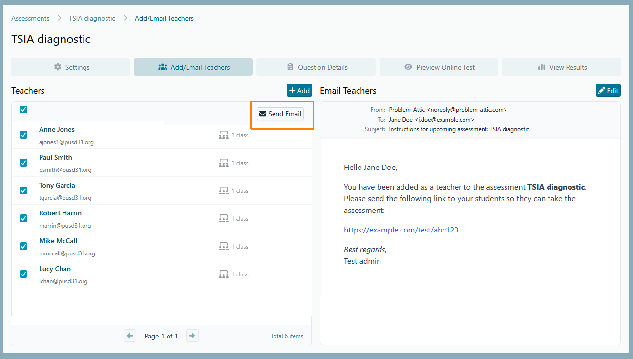 Step 11. The Assessment Manager will send to each teacher an email with a unique link to the test. Teachers will then provide the link to their students. You decide when the email gets sent. Also, you can change the wording and subject line of the email. To do that, click the Edit button.