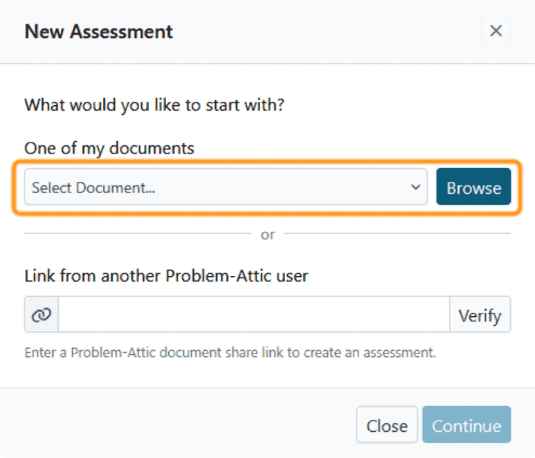 You can also paste-in a document share link from your documents or from another Problem-Attic user (the test does not have to be originally created in your account). Then click the Verify button to make sure the document is a legitimate Problem-Attic document.