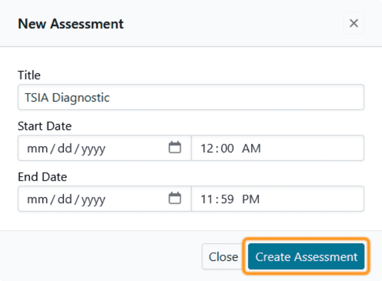 Step 5. Information will be filled in for the assessment. You can set an optional testing window (start and end date) in the dialog or do that later. To continue, click Create Assessment.