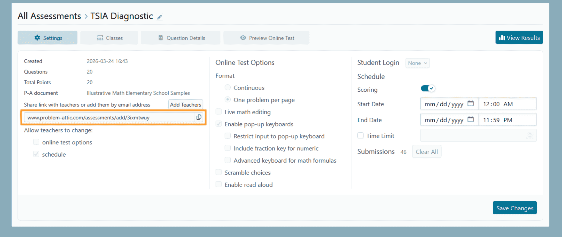 Step 7. Currently, the Assessment Manager will use test settings from Problem-Attic. In the future, you will be able to override them here on the Settings page. For now the only options you may want to change are the start and end times. These restrict the testing window and can be left empty. As long as the Scoring switch is on, students can take the take the test and submit answers.