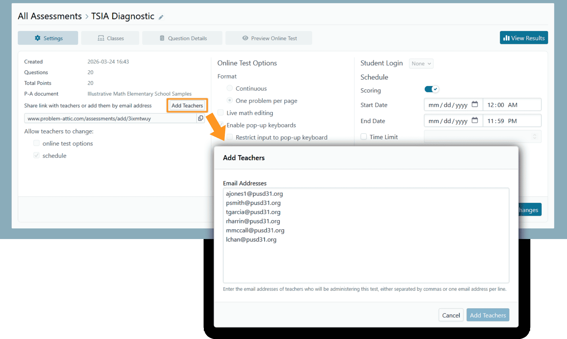 Important: all added teachers must be registered users of Problem-Attic and associated with your school district.