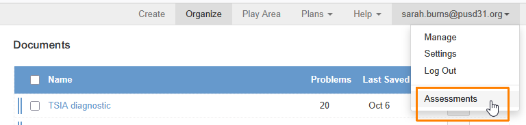 Step 2. Click your user ID (email address) at the top right. In the pop-up menu, choose the new option called “Assessments”.