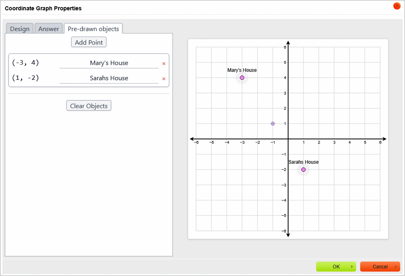 The coordinate graph question type also supports pre-drawn objects. In the In the Pre-drawn objects tab of the Coordinate Graph Properties dialog box, you can add labeled points will appear as part of the coordinate graph for the question.
