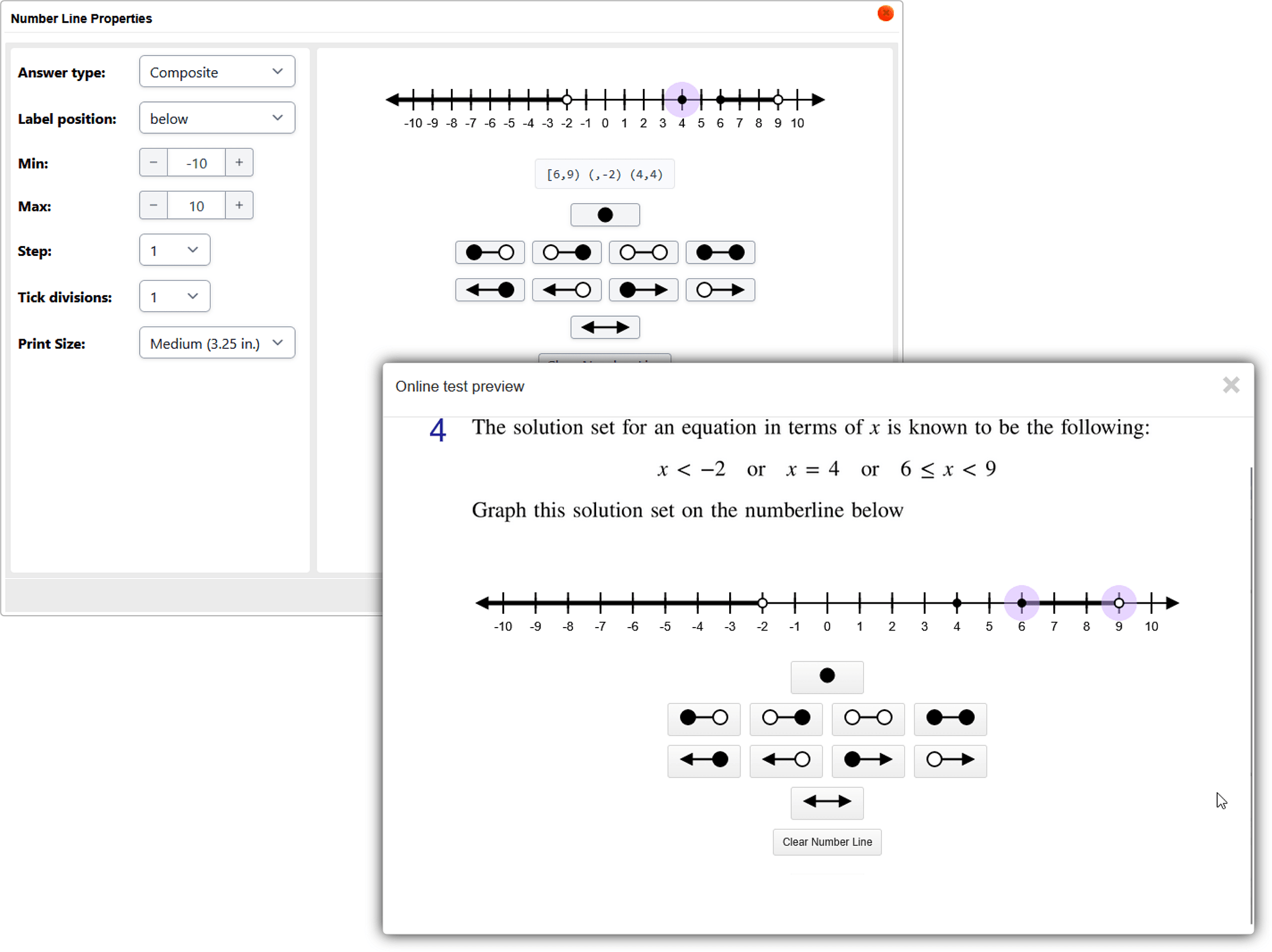 In the editor, click Online Test Preview to see how the number line question will look and behave in an online test. When you are done, close the Preview, then then click Save.